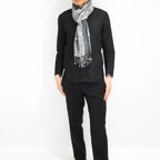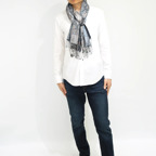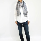 スタンダートな大判サイズで巻いても羽織っても、どちらも使いやすいタイプです。特に羽織は全体の印象がパッと華やかに、エレガントな雰囲気に変化します。