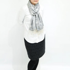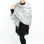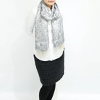 スタンダートな大判サイズで巻いても羽織っても、どちらも使いやすいタイプです。特に羽織は全体の印象がパッと華やかに、エレガントな雰囲気に変化します。