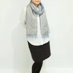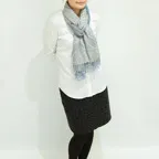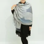 スタンダードな大判サイズで、首に巻くことはもちろん、室内でのひざ掛けにも、肩から羽織る使い方もできます。特に羽織りは、パッと華やかにエレガントな雰囲気に変わります。上半身を覆えるので、着ている服を気にせず合わせることができます。忙しい朝もコーディネートを気にする必要はありません。