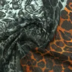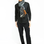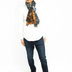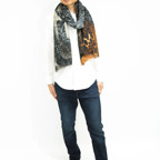 ダイナミックな柄を掛け合わせてアクセントをつけた、大人の遊び心をくすぐる一枚。左右非対称のアシンメトリーデザインで、巻き方によって表情の変化も楽しめます。