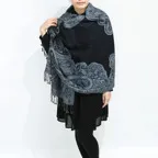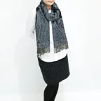 スタンダードな大判サイズで、首に巻くことはもちろん、室内でのひざ掛けにも、肩から羽織る使い方もできます。特に羽織りは、パッと華やかにエレガントな雰囲気に変わります。上半身を覆えるので、着ている服を気にせず合わせることができます。忙しい朝もコーディネートを気にする必要はありません。