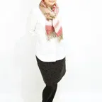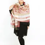 スタンダードな大判サイズで、首に巻くことはもちろん、室内でのひざ掛けにも、肩から羽織る使い方もできます。特に羽織りは、パッと華やかにエレガントな雰囲気に変わります。上半身を覆えるので、着ている服を気にせず合わせることができます。忙しい朝もコーディネートを気にする必要はありません。