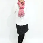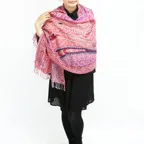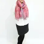 スタンダードな大判サイズで、首に巻くことはもちろん、室内でのひざ掛けにも、肩から羽織る使い方もできます。特に羽織りは、パッと華やかにエレガントな雰囲気に変わります。上半身を覆えるので、着ている服を気にせず合わせることができます。忙しい朝もコーディネートを気にする必要はありません。