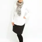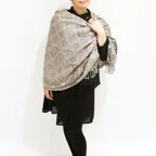 スタンダードな大判サイズで、首に巻くことはもちろん、室内でのひざ掛けにも、肩から羽織る使い方もできます。特に羽織りは、パッと華やかにエレガントな雰囲気に変わります。上半身を覆えるので、着ている服を気にせず合わせることができます。忙しい朝もコーディネートを気にする必要はありません。