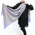 うっとりするようなやわらかさと、ほのかな光沢が魅力のパシュミナ素材。極上素材をさらりとまとう、煌めき仕立ての高級ストールです。