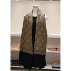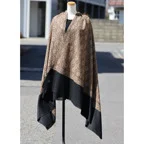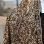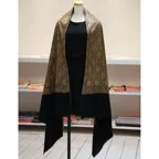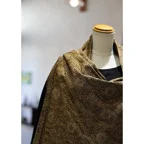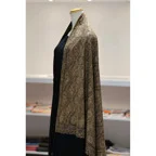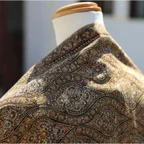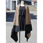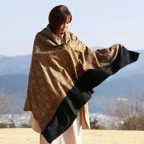 195cm×100cm大判ショールサイズで、巻きでも羽織でもどちらも使いやすいストールです。特に羽織は全面に施された刺繍が美しく輝き、サッとあしらうだけでゴージャスな雰囲気に変化します。横幅が特に長いのでドレスや着物などの羽織物としても重宝します。