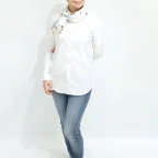 65cm×65cmの小判スカーフで、アスコットタイのようにシャツやブラウスの中におさめて使うこともできます。室内でも巻いたままでいられるので使いやすくなっています。