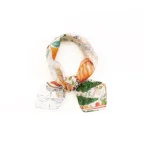65cm×65cmの小判スカーフで、アスコットタイのようにシャツやブラウスの中におさめて使うこともできます。室内でも巻いたままでいられるので使いやすくなっています。