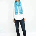 スタンダートな大判サイズで巻いても羽織っても、どちらも使いやすいタイプです。特に羽織は全体の印象がパッと華やかに、エレガントな雰囲気に変化します。