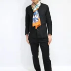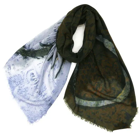 ちょっとだけ間の抜けた愛嬌のあるモチーフが目を引くデザイン。でも巻いてみるとすごくにしっくりきてしまう・・・ とても不思議な一枚です。