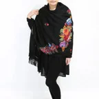コントラストの効いた手刺繍が美しい一枚。日常が優雅に変わる。大人の女性のためのドレスアップストールです。