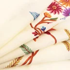 刺繍部は全て手仕事によって行われています。そのため、刺繍の裏地は処理しきれなかった糸が出ている箇所がございます。刺繍部の素材はコットン・レーヨンとなっております。