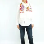 全面に施されたアーリ刺繍は誰もが振り返るほどの美しさ。ひとたび羽織ればパッと華やかにゴージャスな雰囲気に変わります。上半身を覆えるので、着ている服を気にせず合わせることができます。