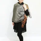 生地の向こうに透けるトップスや素肌が美しく見える、まるでメイクの仕上げに使うパウダーのようなストール。程よいハリ感があり、肌に付かず離れずの質感になっています。絶妙なボリューム感と美しいシルエットも他とは違う大きな魅力です。