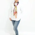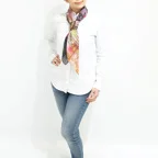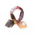 88cm×88cmの大判スカーフで、首元のアクセントに最適。アスコットタイのようにシャツやブラウスの中におさめて使うこともできますし、対角で畳んで肩から羽織ることもできます。また、身につけるだけでなく、手持ちのバッグにキュッと結べるアクセサリーとしても重宝します。