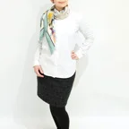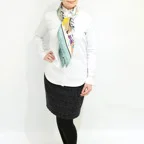 スクエアサイズで、アスコットタイのようにシャツやブラウスの中におさめて使うこともできます。室内でも巻いたままでいられるので使いやすくなっています。
