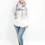 大判サイズのストールで肩から羽織る使い方もできます。春夏の日除けや室内の冷房対策としても使いやすくなっています。