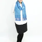 スタンダートな大判サイズで巻いても羽織っても、どちらも使いやすいタイプです。特に羽織は全体の印象がパッと華やかに、エレガントな雰囲気に変化します。