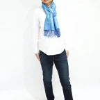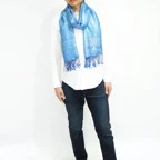 スタンダートな大判サイズで巻いても羽織っても、どちらも使いやすいタイプです。特に羽織は全体の印象がパッと華やかに、エレガントな雰囲気に変化します。
