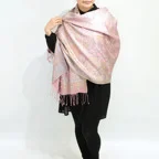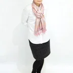 スタンダートな大判サイズで巻いても羽織っても、どちらも使いやすいタイプです。特に羽織は全体の印象がパッと華やかに、エレガントな雰囲気に変化します。