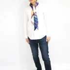 スクエアサイズで、アスコットタイのようにシャツやブラウスの中におさめて使うこともできます。室内でも巻いたままでいられるので使いやすくなっています。