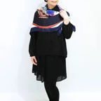 色彩とラインが織りなす、デザイン性の高い一枚。多色使いで合わせやすく、首元のアクセントに最適です。