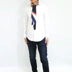 スクエアサイズで、アスコットタイのようにシャツやブラウスの中におさめて使うこともできます。室内でも巻いたままでいられるので使いやすくなっています。