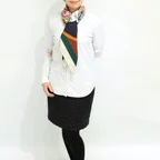 スクエアサイズで、アスコットタイのようにシャツやブラウスの中におさめて使うこともできます。室内でも巻いたままでいられるので使いやすくなっています。