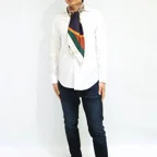 スクエアサイズで、アスコットタイのようにシャツやブラウスの中におさめて使うこともできます。室内でも巻いたままでいられるので使いやすくなっています。