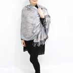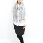 スタンダートな大判サイズで巻いても羽織っても、どちらも使いやすいタイプです。特に羽織は全体の印象がパッと華やかに、エレガントな雰囲気に変化します。