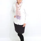 スタンダートな大判サイズで巻いても羽織っても、どちらも使いやすいタイプです。特に羽織は全体の印象がパッと華やかに、エレガントな雰囲気に変化します。