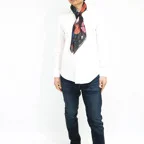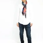 88cm×88cmの大判スカーフで、首元のアクセントに最適。アスコットタイのようにシャツやブラウスの中におさめて使うこともできますし、対角で畳んで肩から羽織ることもできます。また、身につけるだけでなく、手持ちのバッグにキュッと結べるアクセサリーとしても重宝します。