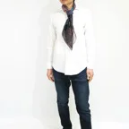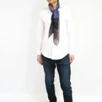 88cm×88cmの大判スカーフで、首元のアクセントに最適。アスコットタイのようにシャツやブラウスの中におさめて使うこともできますし、対角で畳んで肩から羽織ることもできます。また、身につけるだけでなく、手持ちのバッグにキュッと結べるアクセサリーとしても重宝します。