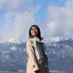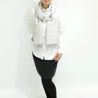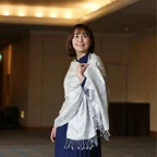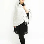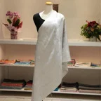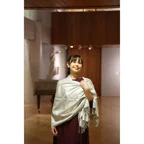 スタンダートな大判サイズで巻いても羽織っても、どちらも使いやすいタイプです。特に羽織は全体の印象がパッと華やかに、エレガントな雰囲気に変化します。