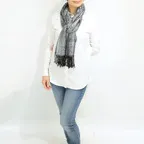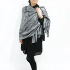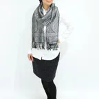 スタンダートな大判サイズで巻いても羽織っても、どちらも使いやすいタイプです。特に羽織は全体の印象がパッと華やかに、エレガントな雰囲気に変化します。