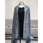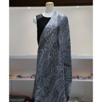 スタンダートな大判サイズで巻いても羽織っても、どちらも使いやすいタイプです。特に羽織は全体の印象がパッと華やかに、エレガントな雰囲気に変化します。