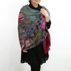 シックな花柄が効いた高級感あふれるデザイン。落ち着いたトーンで着まわしやすいアクセントストールです。