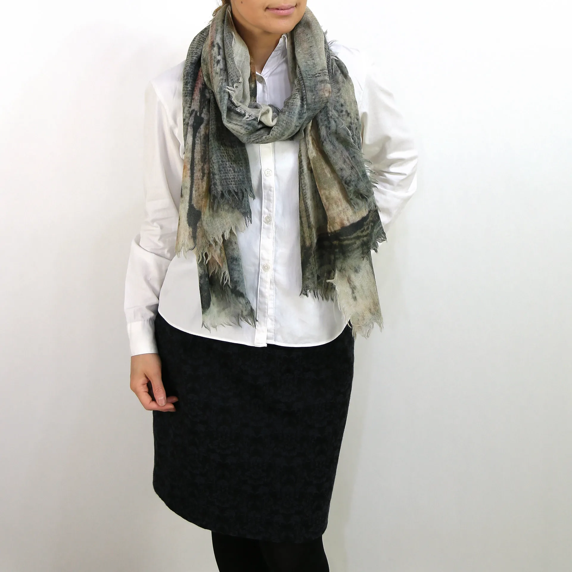 大判の長方形で、端面はナチュラルな断ち切り加工を施しています。どんな巻き方をしても表情豊かでお洒落な印象になります。また、折りたたんで使えばスッキリとシャープなシルエットになります。