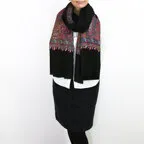 195cm×100cm大判ショールサイズで、巻きでも羽織でもどちらも使いやすいストールです。特に羽織は全面に施された刺繍が美しく輝き、サッとあしらうだけでゴージャスな雰囲気に変化します。横幅が特に長いのでドレスや着物などの羽織物としても重宝します。