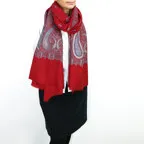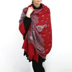 195cm×100cm大判ショールサイズで、巻きでも羽織でもどちらも使いやすいストールです。特に羽織は全面に施された刺繍が美しく輝き、サッとあしらうだけでゴージャスな雰囲気に変化します。横幅が特に長いのでドレスや着物などの羽織物としても重宝します。