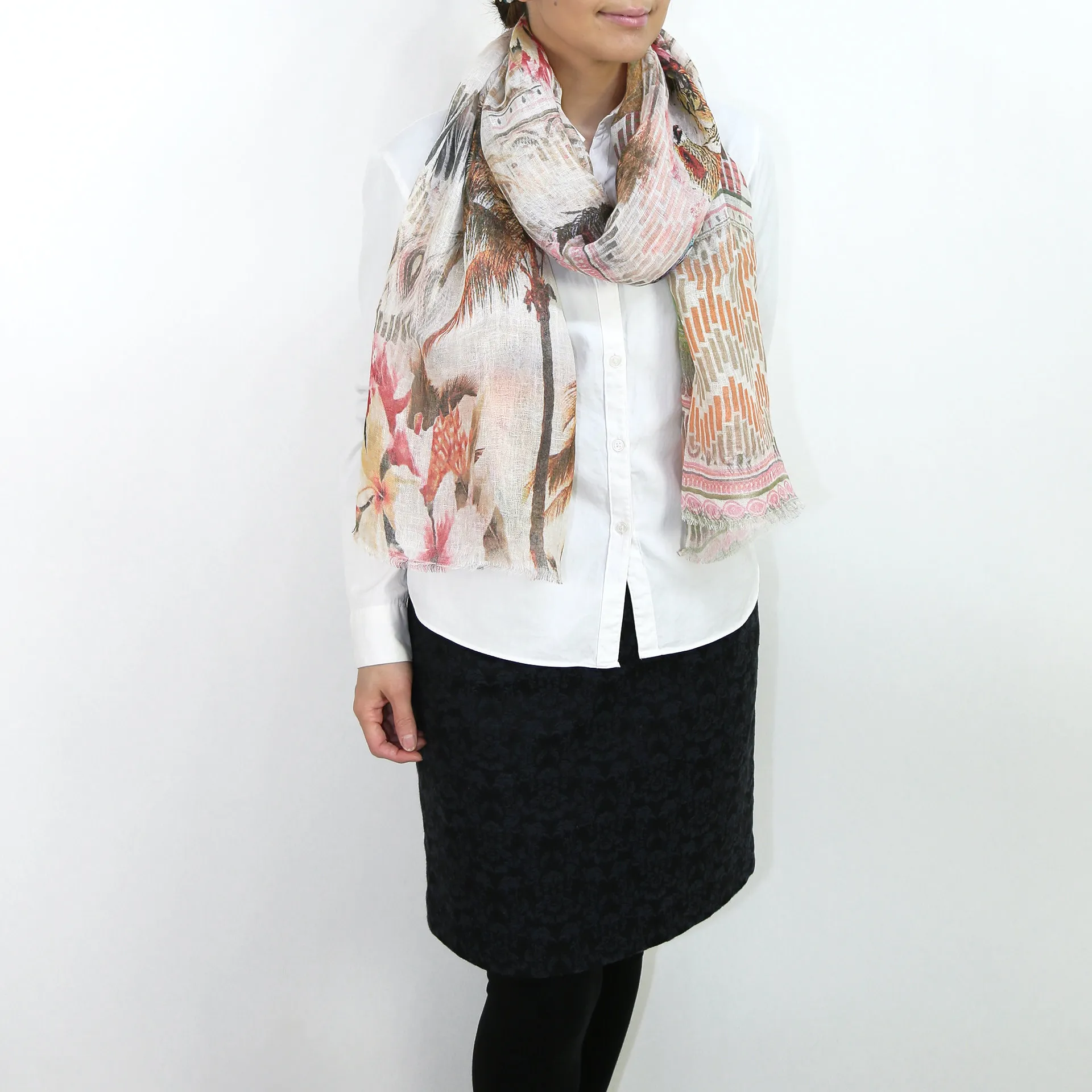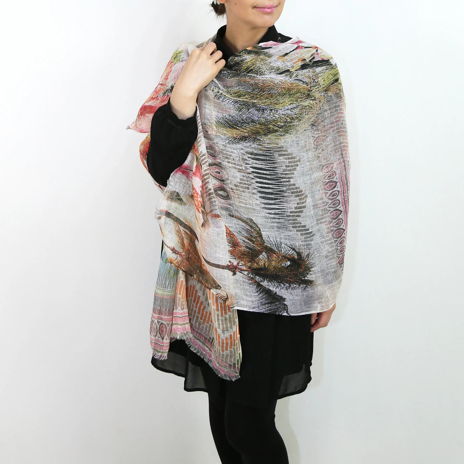 大判サイズのストールで肩から羽織る使い方もできます。春夏の日除けや室内の冷房対策としても使いやすくなっています。