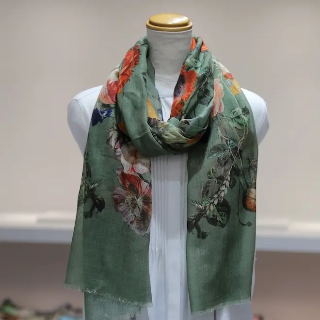 生地感よりカジュアルな普段使いにも、少しフォーマルなシーンでも使いやすいタイプです。スタイルや場所を問わず合わせることができる優れたストールです。