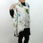 大判サイズのストールで肩から羽織る使い方もできます。春夏の日除けや室内の冷房対策としても使いやすくなっています。