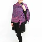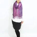 スタンダートな大判サイズで巻いても羽織っても、どちらも使いやすいタイプです。特に羽織は全体の印象がパッと華やかに、エレガントな雰囲気に変化します。