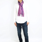 スタンダートな大判サイズで巻いても羽織っても、どちらも使いやすいタイプです。特に羽織は全体の印象がパッと華やかに、エレガントな雰囲気に変化します。