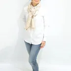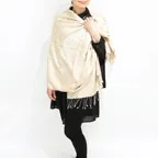 スタンダートな大判サイズで巻いても羽織っても、どちらも使いやすいタイプです。特に羽織は全体の印象がパッと華やかに、エレガントな雰囲気に変化します。