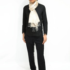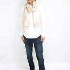 スタンダートな大判サイズで巻いても羽織っても、どちらも使いやすいタイプです。特に羽織は全体の印象がパッと華やかに、エレガントな雰囲気に変化します。