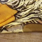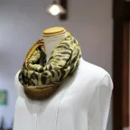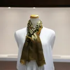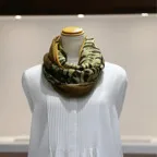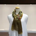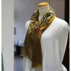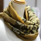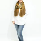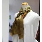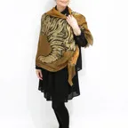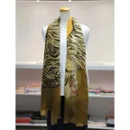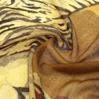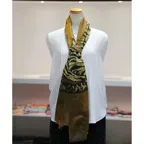 インパクトのあるモチーフが描かれたデザイン。ダイナミックな柄ですが、実際に巻くと想像以上に合わせやすい一枚です。