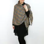 スタンダードな大判サイズで、首に巻くことはもちろん、室内でのひざ掛けにも、肩から羽織る使い方もできます。特に羽織りは、パッと華やかにエレガントな雰囲気に変わります。上半身を覆えるので、着ている服を気にせず合わせることができます。忙しい朝もコーディネートを気にする必要はありません。