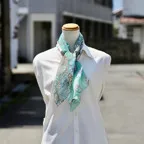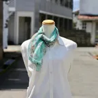 小ぶりなスクエアサイズで、アスコットタイのようにシャツやブラウスの中におさめて使うこともできます。室内でも巻いたままでいられるので使いやすくなっています。